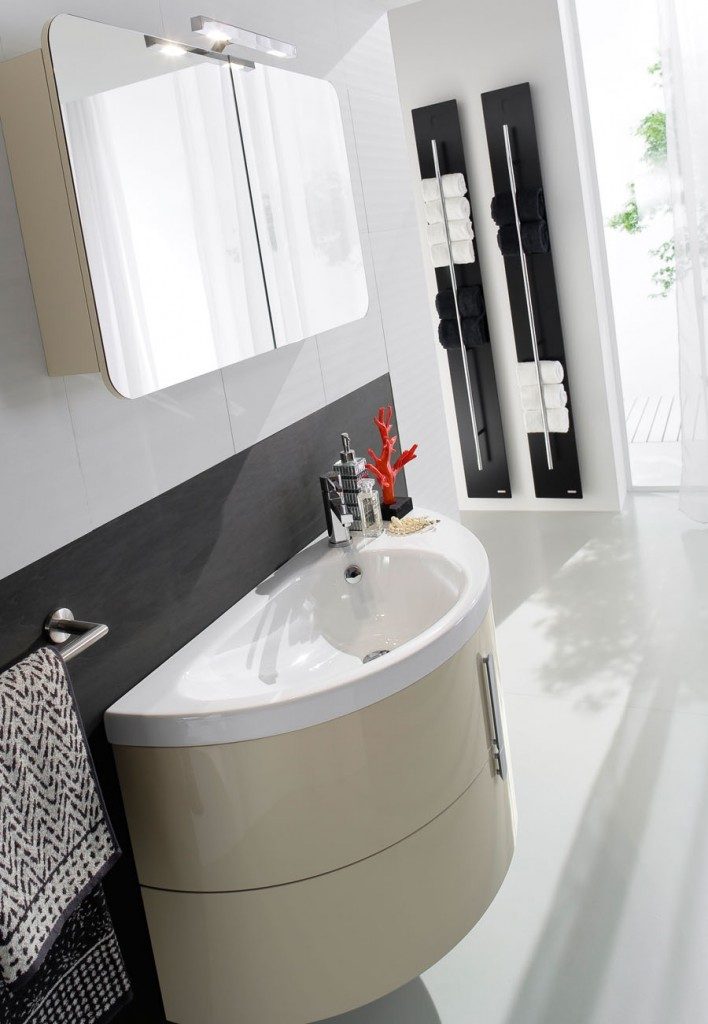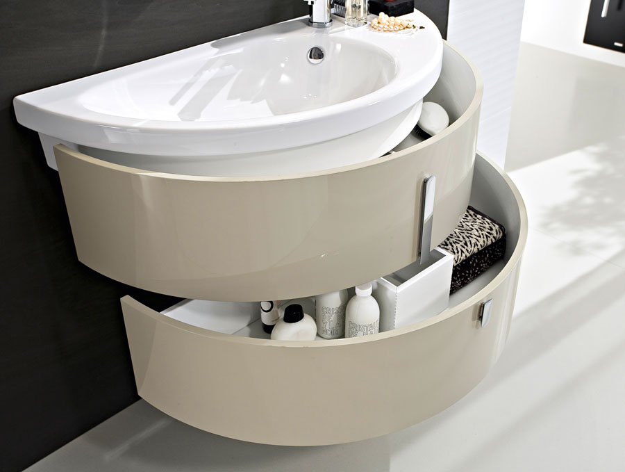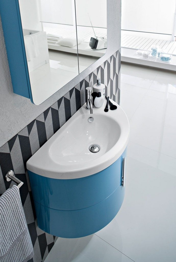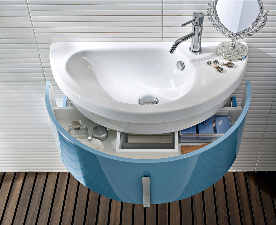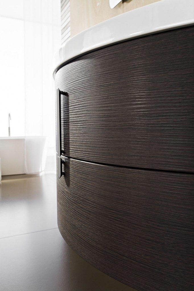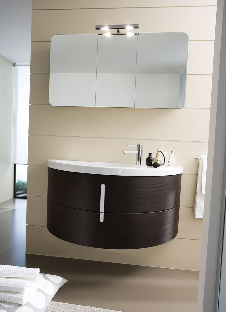 Gebogene Badezimmermöbel sind die ideale Lösung, um auch in kleinen Räumen moderne Bäder zu realisieren, die den Durchgang erleichtern und die Struktur schlanker und platzsparend machen. Die Schlichtheit und Einfachheit dieser Badezimmermöbel schließt ihre Eleganz und ästhetische Wirkung, die in jedem Detail erkennbar ist, nicht aus: vom gebogenen Badezimmerschrank in Hängeausführung bis zu den weichen, abgerundeten Linien der Hängeschränke, den Badezimmerspiegeln und den passenden Hochschränken. Die zahlreichen Oberflächenausführungen werden jedem Geschmack und Stil gerecht.