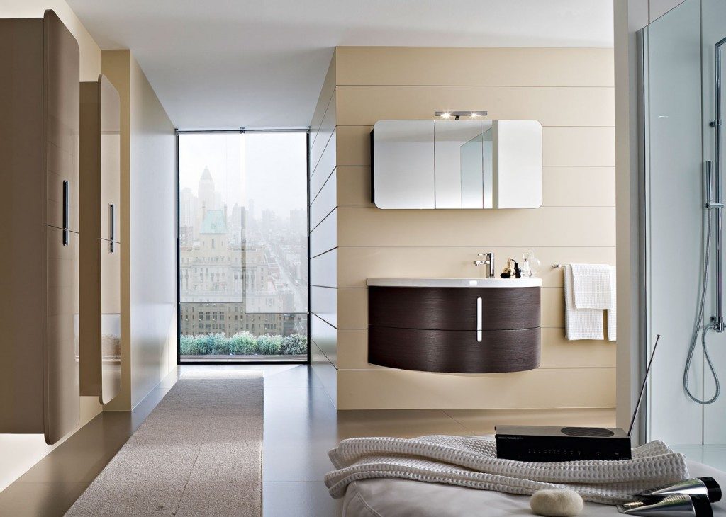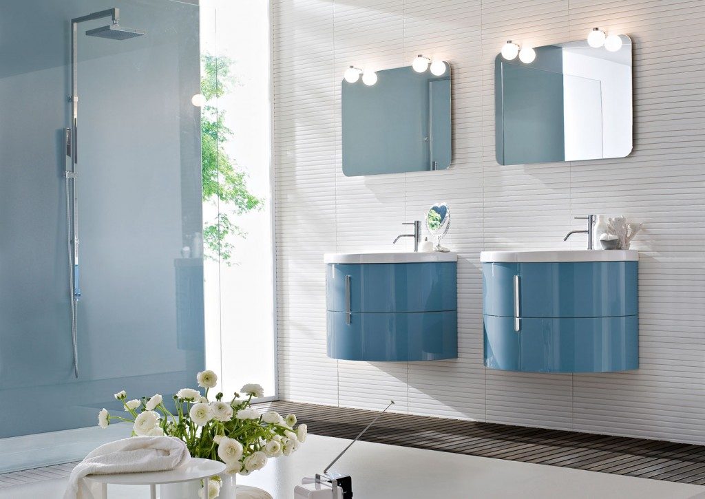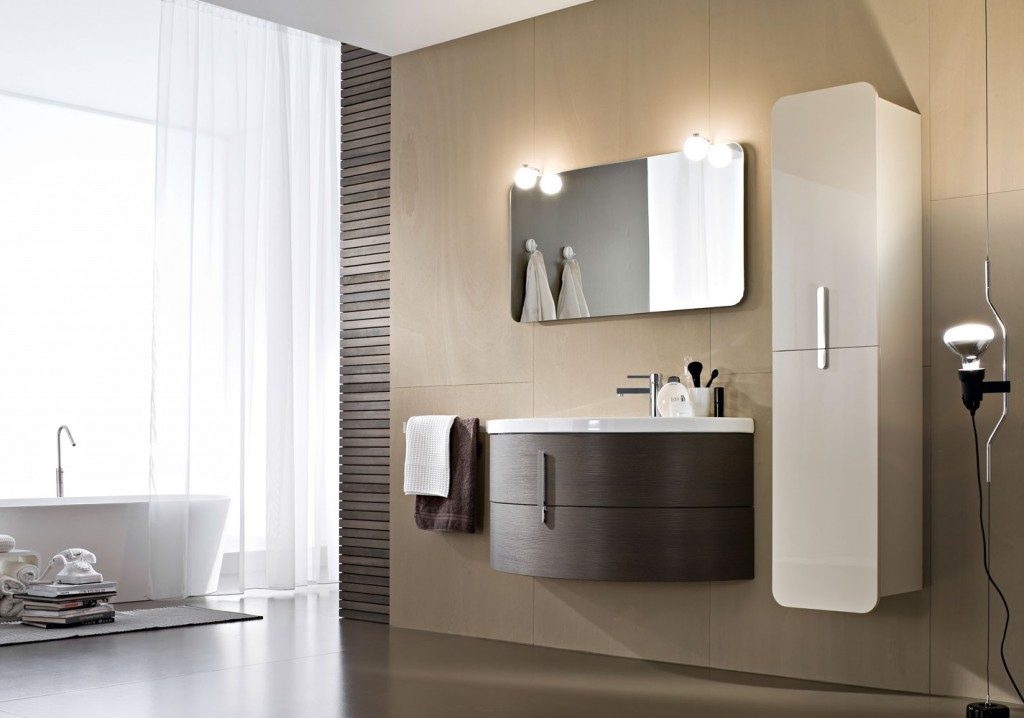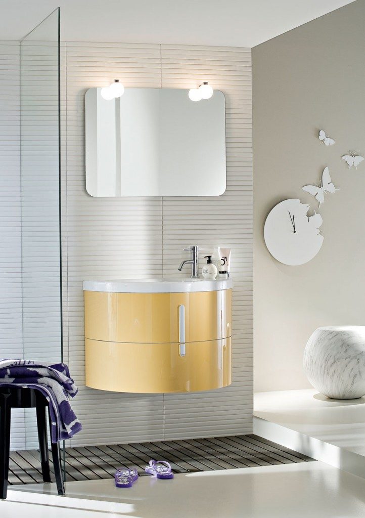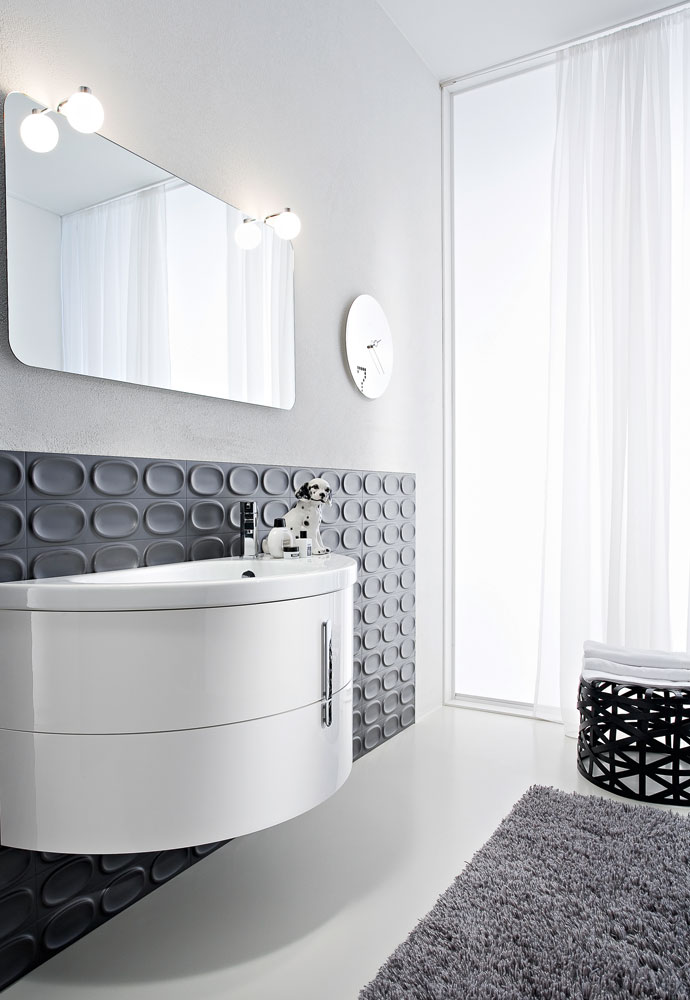 Gebogene Badezimmermöbel sind die ideale Lösung, um auch in kleinen Räumen moderne Bäder zu realisieren, die den Durchgang erleichtern und die Struktur schlanker und platzsparend machen. Die Schlichtheit und Einfachheit dieser Badezimmermöbel schließt ihre Eleganz und ästhetische Wirkung, die in jedem Detail erkennbar ist, nicht aus: vom gebogenen Badezimmerschrank in Hängeausführung bis zu den weichen, abgerundeten Linien der Hängeschränke, den Badezimmerspiegeln und den passenden Hochschränken. Die zahlreichen Oberflächenausführungen werden jedem Geschmack und Stil gerecht.