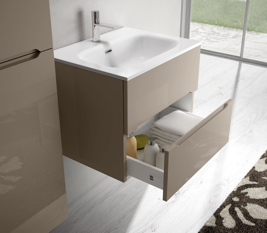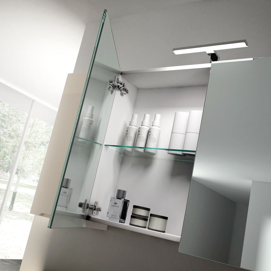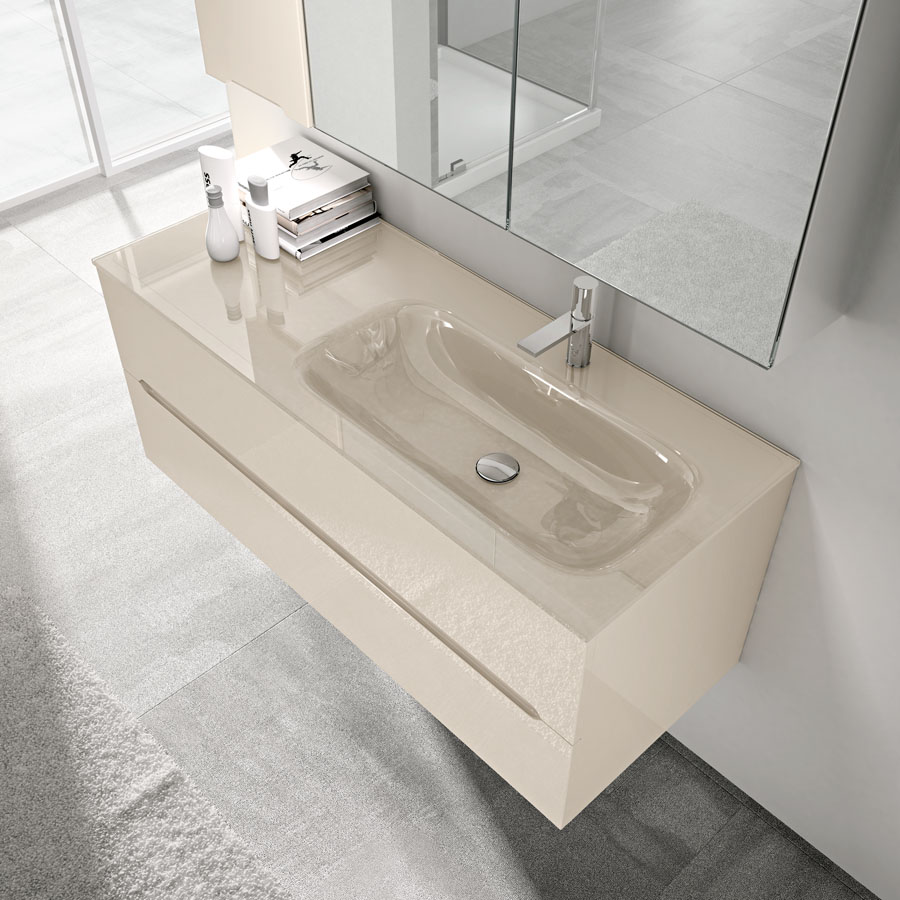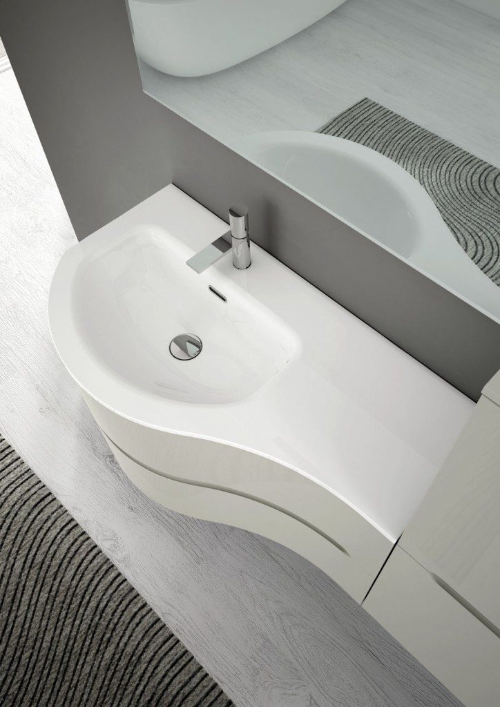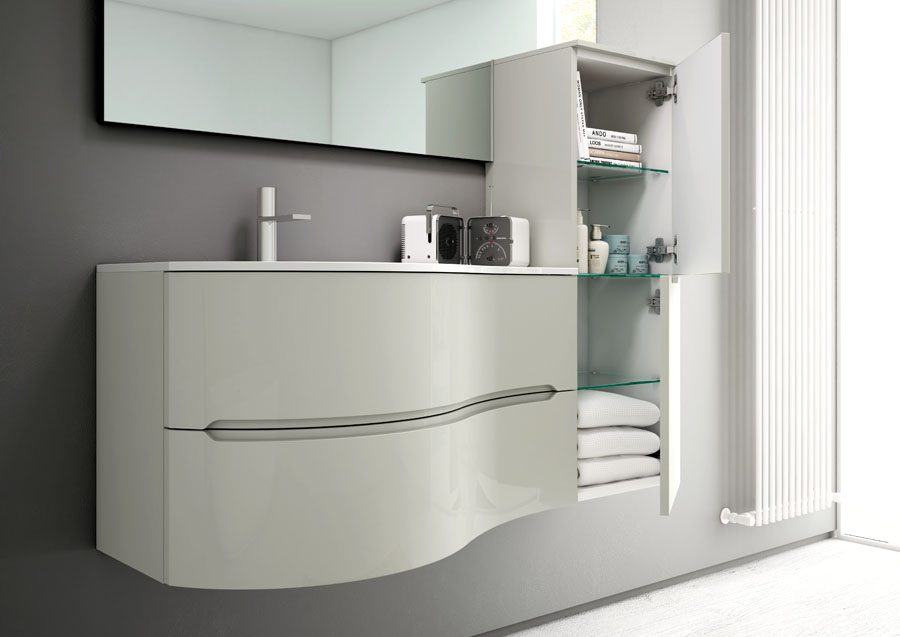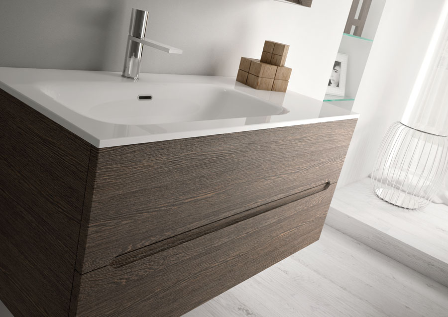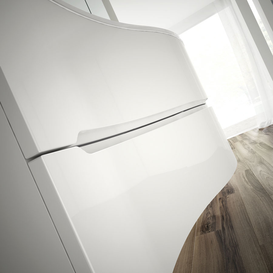Das Identifikationselement der Kollektion ist das Badezimmermöbel mit doppeltem Schubkasten , das viel Stauraum bietet und dem Badezimmer eine große Funktionalität verleiht. Die Öffnung wird durch die großen, attraktiven in die Tür versenkten Griffe erleichtert; die Form des abgerundeten Badezimmermöbels verleiht dem Ambiente eine angenehm harmonische Note. Die Kollektion ist mit Einzel- oder Doppelwaschbecken erhältlich, das die Oberfläche teilt und absolute Bewegungsfreiheit gewährleistet. Das dezentriert eingebaute Waschbecken stellt eine Variante des Badezimmereinrichtungsprojekts dar, die einen feinen, originellen Dynamismus bevorzugt. Der große Spiegelschrank ist mit einem geräumigen Fach ausgestattet und stellt eine optimale Lösung für diejenigen dar, die einen größeren Platzbedarf haben.